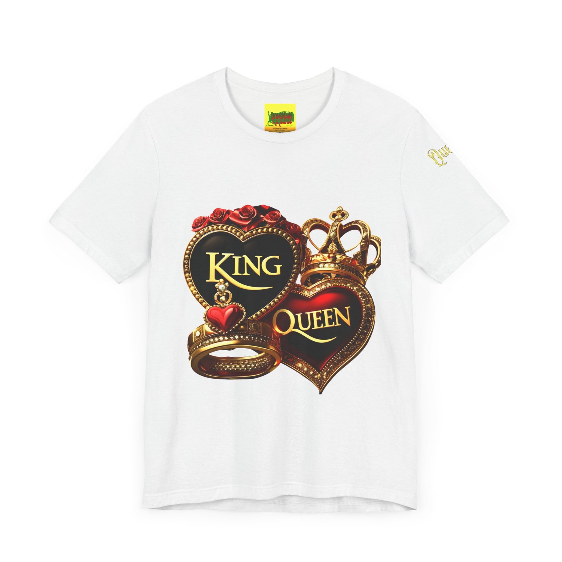 Elevate your wardrobe with this stylish Lion's Main Apparel Royalty King & Queen Tee Unisex Jersey Short Sleeve Tee, designed for those who embrace their royal flair. Featuring a vibrant graphic of crowns and hearts, this tee exudes confidence and charm. Perfect for layering or wearing solo, it's a versatile piece that enhances both casual outings and more polished occasions. Ideal for couples celebrating anniversaries, Valentine's Day, or anyone in search of a unique outfit for themed parties or everyday wear. Whether you're gifting it to a loved one or treating yourself, this tee brings a touch of regality to everyday life.